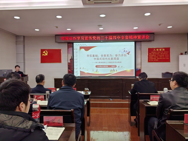 为推动党的二十届四中全会精神在国防动员领域落地生根、入脑入心,近日,市国动办举行学习贯彻党的二十届四中全会精神专题辅导报告会。市委宣讲团成员、市委党校副校长周国平应邀作专题宣讲,市国动办全体在职干部职工及部分退休党员参加报告会。