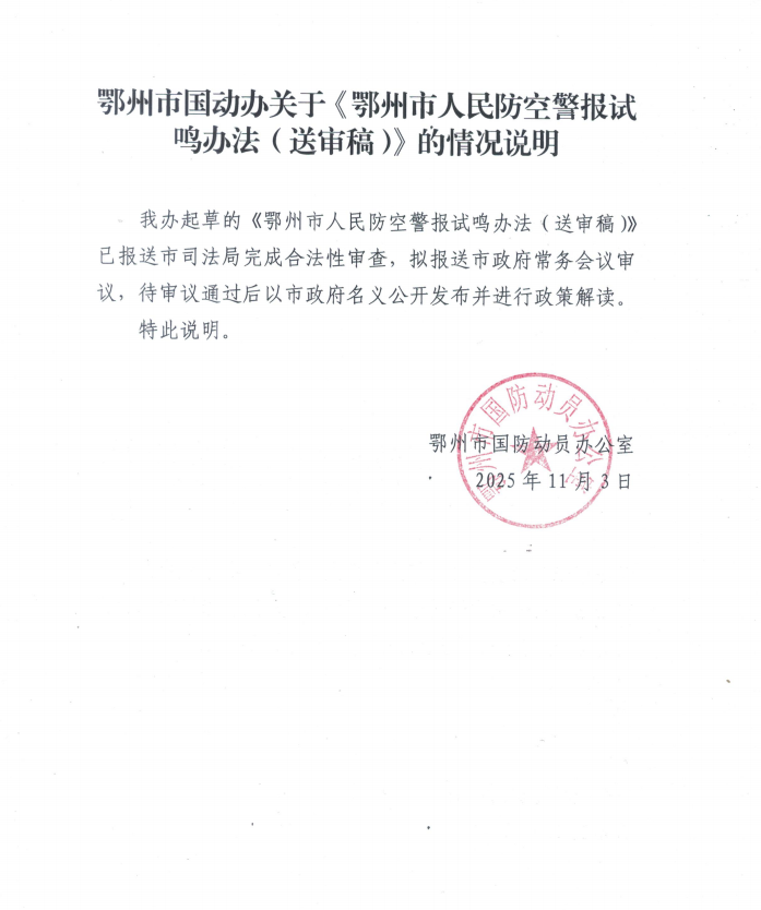 鄂州市国动办关于《鄂州市人民防空警报试鸣办法(送审稿)》的情况说明