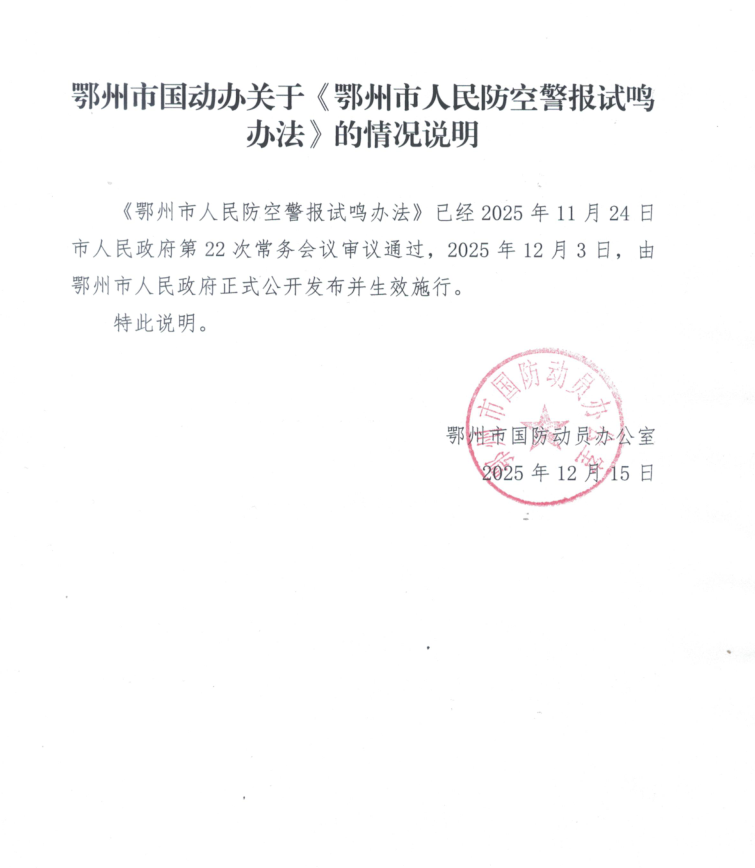 鄂州市国动办关于《鄂州市人民防空警报试鸣办法》的情况说明